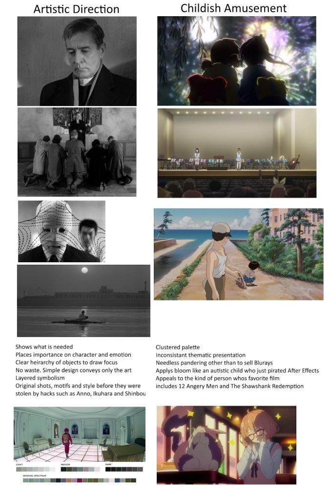 >>219330162cinema is about artthis is just artifice, art makes you think, about yourself, the world, or w/e.artifice makes you think about the work itself, how it's made, what techniques were used and the level of skill involved anime is still not cinema