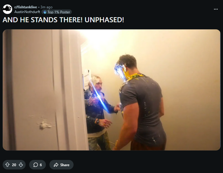 The biggest fishtank fan is revealed and shows his feathers... I SEE EVERY ANGLE! I KNOW THE SHOW TOO WELL! I AM THE STAR!!! The xternal becomes internal. Beautiful.