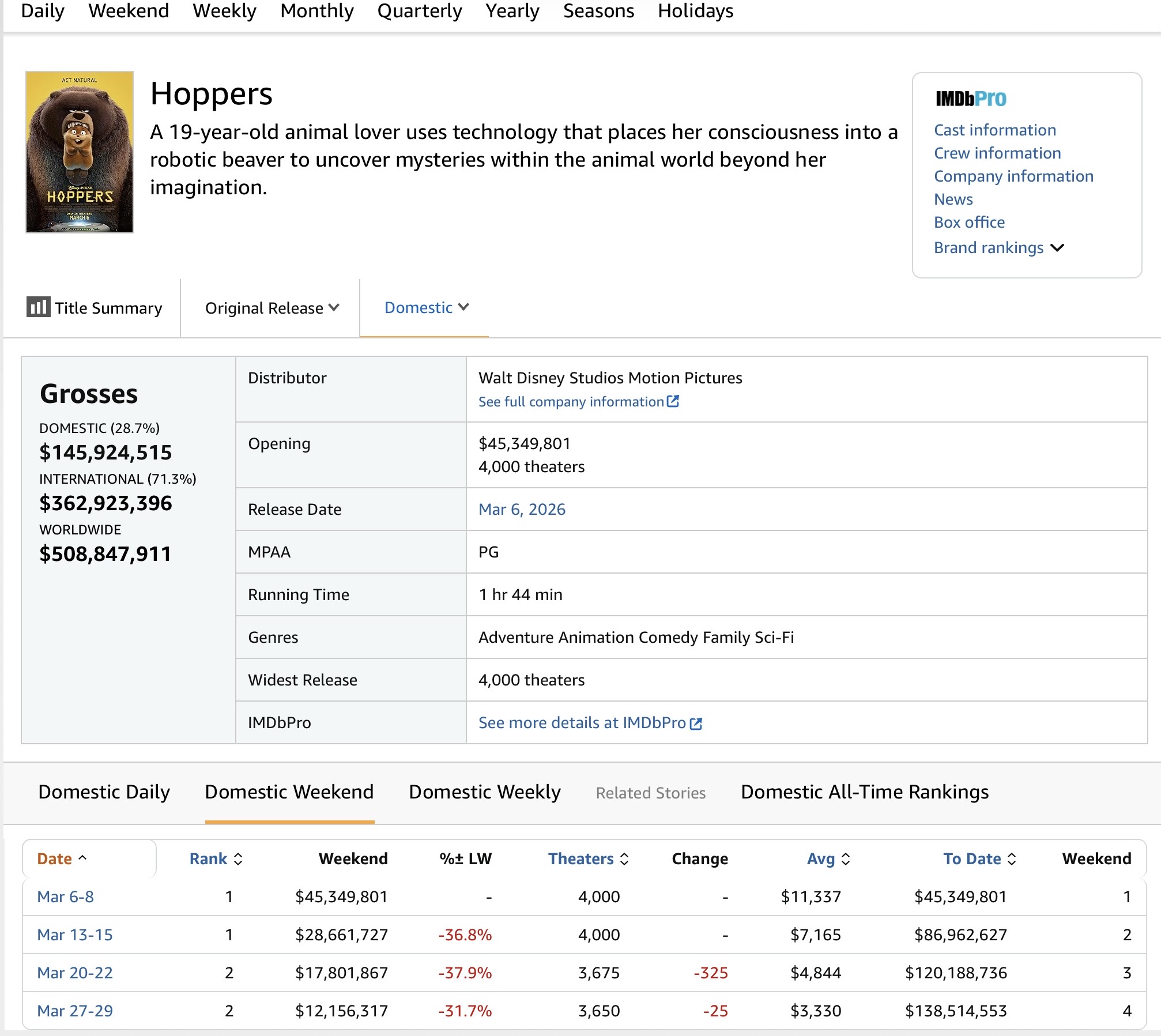 True, that new Toy Story sequel nobody wants will probably make 3 times what Hoppers did. I have kids and didn't even know Hoppers existed, my kids usually tell me about movies like this but they didn't know it existed. Means Disney barely did any marketing for it.