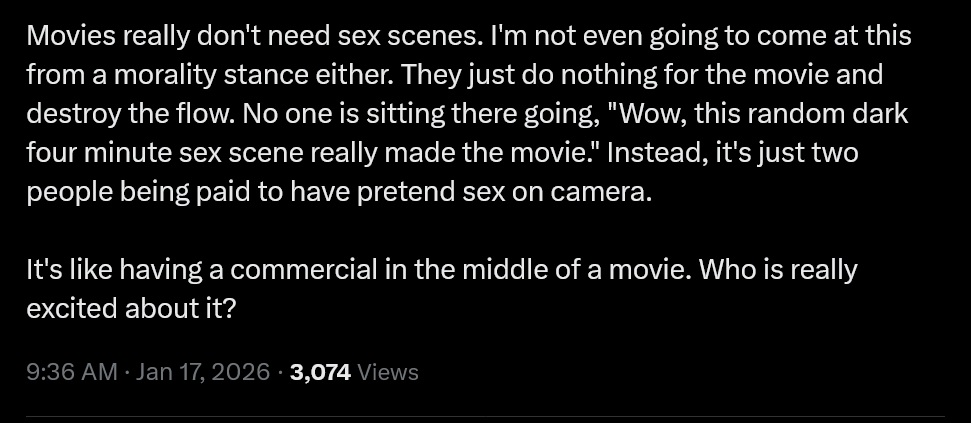>>219382130He's right. Sex scenes are boring and serve no purpose. You can get the same effect from a cutaway. It's a waste of runtime.