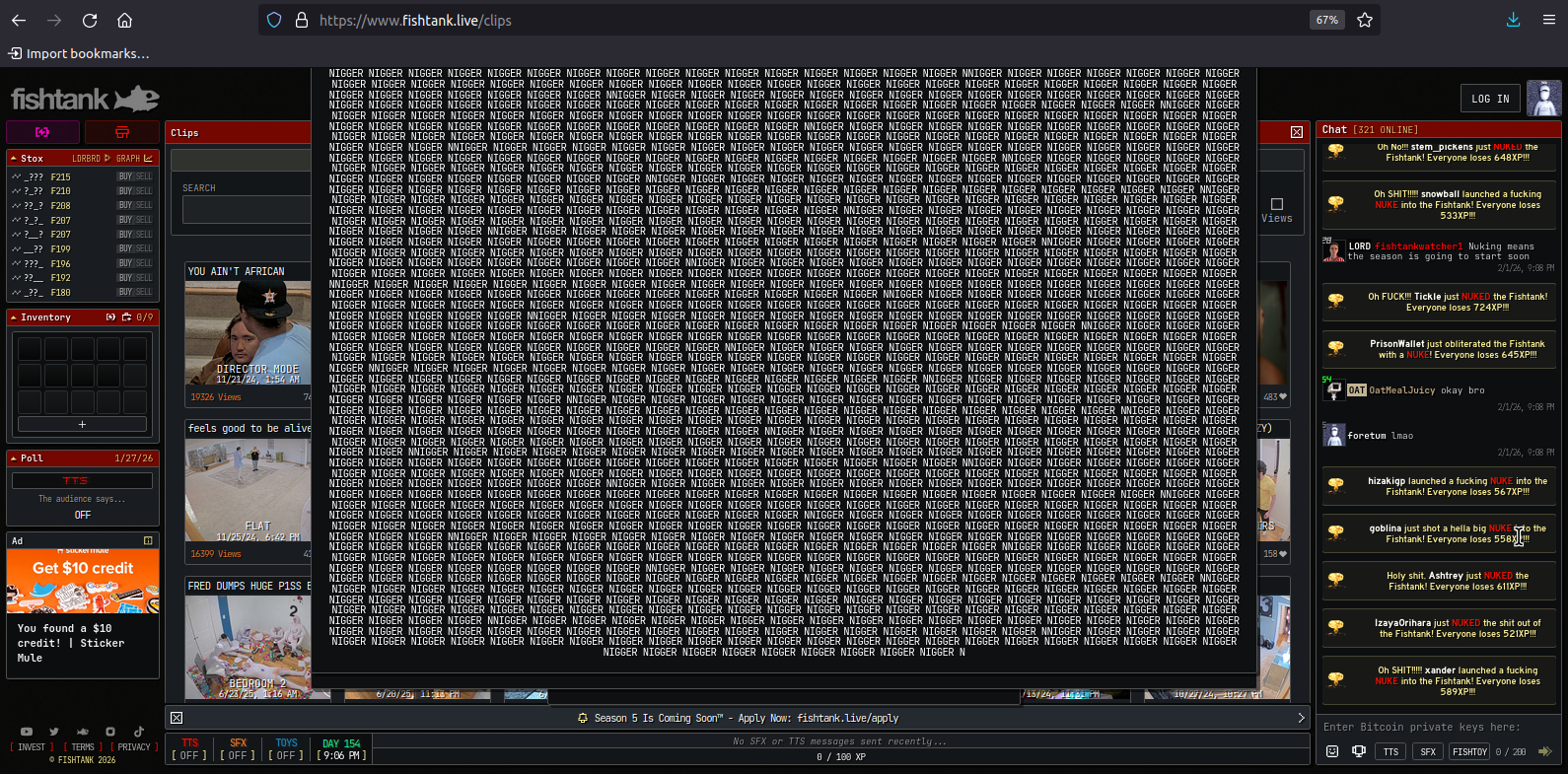 I made the fishtank Doomer Chud better edition >FTL NEWS:-- Bam stumbled in from the basement with one shoe missing and one shoe untied, seemingly to Jet's frustration and mild panic. Bam was quickly removed from the tank by Ben. All cams cut shortly after. (Rumors of Bam both relapsing and also being scammed by the wiggers spreading.)--Vimp and Bashir are hitting it off in the arena, and won the poll for the director to focus on them tonight. (But director cam has been focused on the loser dunyaye instead.)-- Duanye is mad at bashir for not betraying his morals or religion for a dumb challenge-- The current challenge is a candy elimination-- 4chan Jannies are getting their doxx and nudes posted on our threads. Please stop this. It's off topic>Links:https://www.fishtank.livehttps://kick.com/fishtankhttps://classic.fishtank.livehttps://x.com/fishtankislivehttps://www.instagram.com/fishtank.live/https://www.youtube.com/@fishtankislivehttps://fishtanklive.fandom.com/wiki/Fishtanklive_WikLast Canon Bake >>219394429