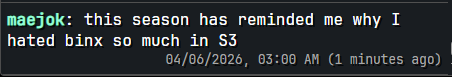 >>219402712Drunk POS was top 5 days of all time, makes the rest of the season feel so shit