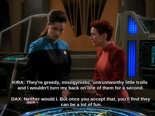 >”I'm sorry, but it's time he learned that when it comes to accumulating profit, women are as capable as men.”>literally makes Quark lose all his Gamma quadrant profits not 2 minutes earlier because she was emotionalIs there a single moralizing episode that isn’t completely undercut by the script’s actual plot? I swear it happens every single time they try.