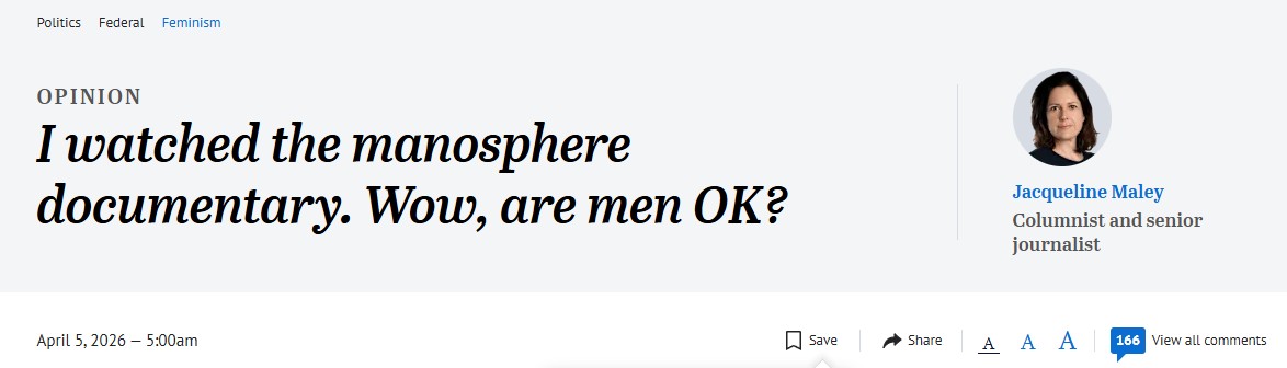 >>219406057You could always read the article you knowhttps://www.sMh.com.au/politics/federal/i-watched-the-manosphere-documentary-wow-are-men-ok-20260402-p5zl0w.html