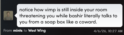 she'll be sitting on the couch with binx by the end of the night laughing about how bashir is autistic and a virgin