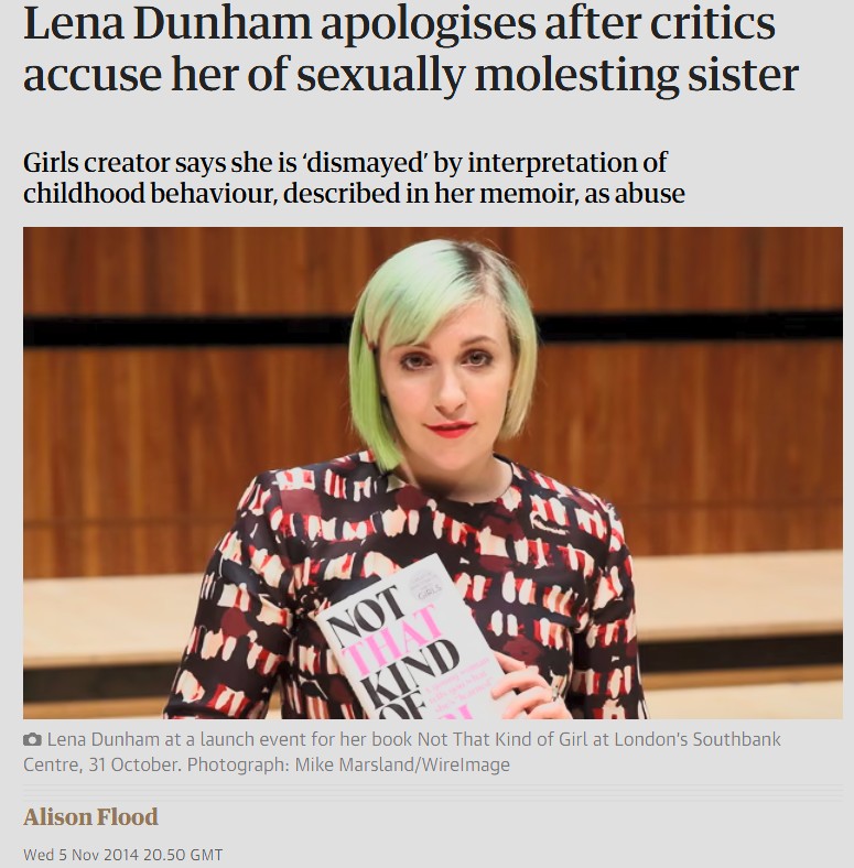 This reminds me of Lena Dunham from Girls.>The passages cited include one that describes an incident when Dunham was seven and her sister was one and playing on the driveway. Dunham writes that “curiosity got the best” of her and she opened her sister’s vagina only to call for her mother when she found the toddler had “six or seven pebbles in there”.Why do people admit this shit?