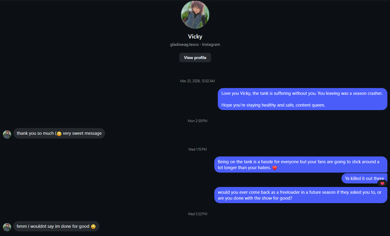 She likes him though and has been defending him in chat (probably just because he said she was one of his favorite fish but still)