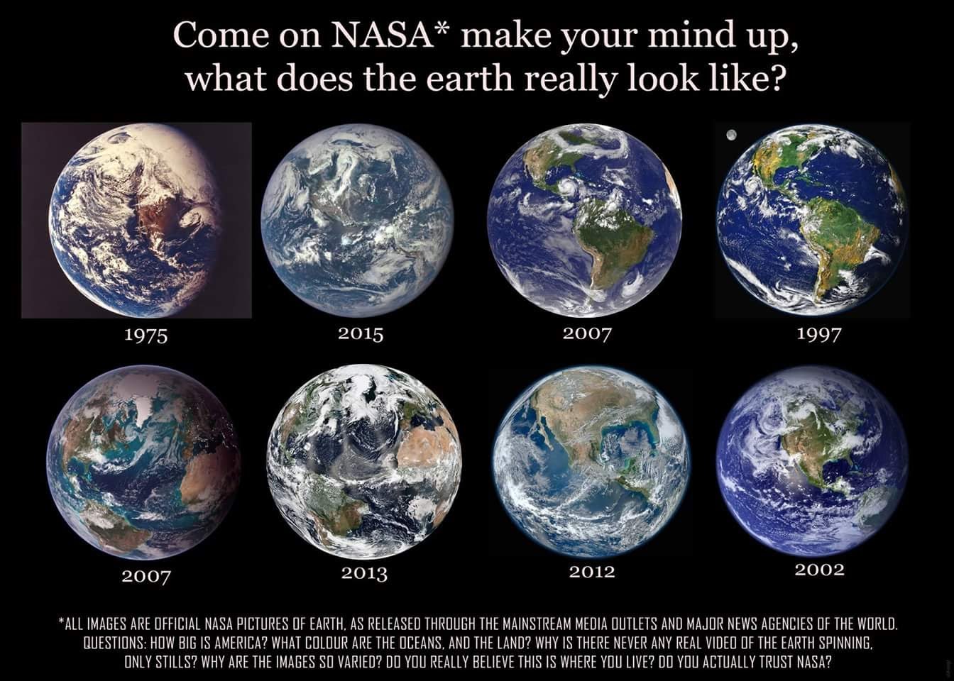 >>219445657all of them look fine except the 1997 and 2012 ones>How big is America?looks the same size except in 2012 which probably was taken from a lower altitude>What colour are the oceans, and the land?never heard of different cameras and camera settings?>Why is there never any real video of the Earth spinning, only stills?because the Earth only spins once every 24 hours, and the only things taking pictures of the Earth are orbiting it and so aren't in a fixed position for 24 hours>Do you really believe this is where you live?it appears to be, yes>Do you actually trust NASA?there are many, many ways to verify the Earth is a globe, and many people and agencies that have done so besides NASA throughout history