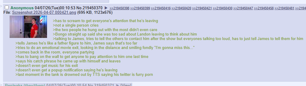 >>219456285 bro that was the only time the house felt actually alive. just pure caveman energy, no bits, no forced bits, just BONGO smash. meanwhile everyone else is doing therapy circle podcasts and fake drama arcs. him shoulder checking doors like they owed him money was peak content and you know production was seething trying to frame it as “concerning behavior” instead of admitting it was the hardest the stream’s hit all week.