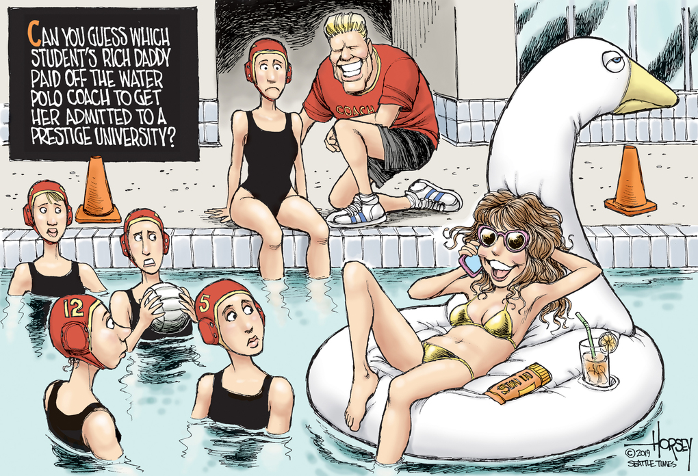 He never misses a chance to draw some babes. Apparently rich women on college swim teams is a pressing issue?
