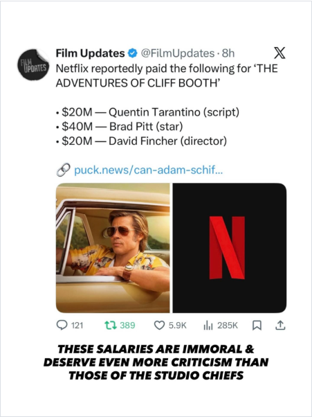 >>219459970How is it not complicated? You’re arguing that there’s a demand for Brad Pitt worth $20 million unrecognized in the streaming market. Nobody, ever, in the history of the world, has thought “I need to subscribe to Netflix, they have Brad Pitt.” They might think “oh Netflix has Inglourious Basterds, I liked that. Sure I’ll try a month.” These idiots still operate under the idea that action movie stars like Schwarzenegger are still a thing, they’re not. Absolutely fucking no one is going to subscribe to Netflix to watch the misadventures of Cliff Booth lmao