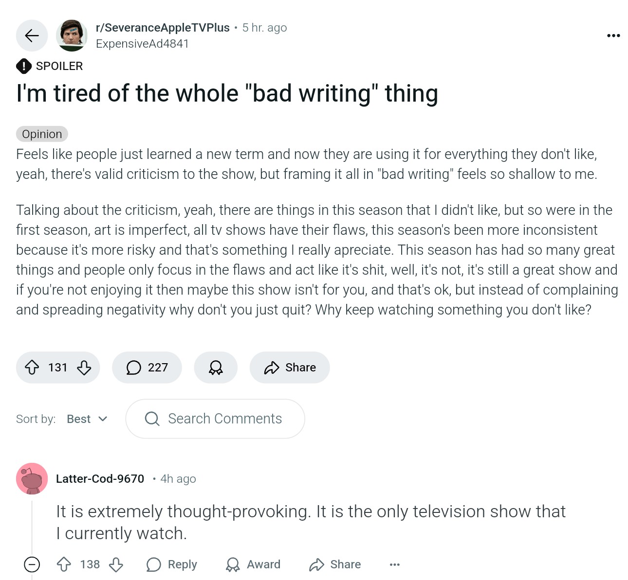 >>219468784i can't understand how you can think that severance seaon 2 was bad yet at the same time think westworld season 1 was not