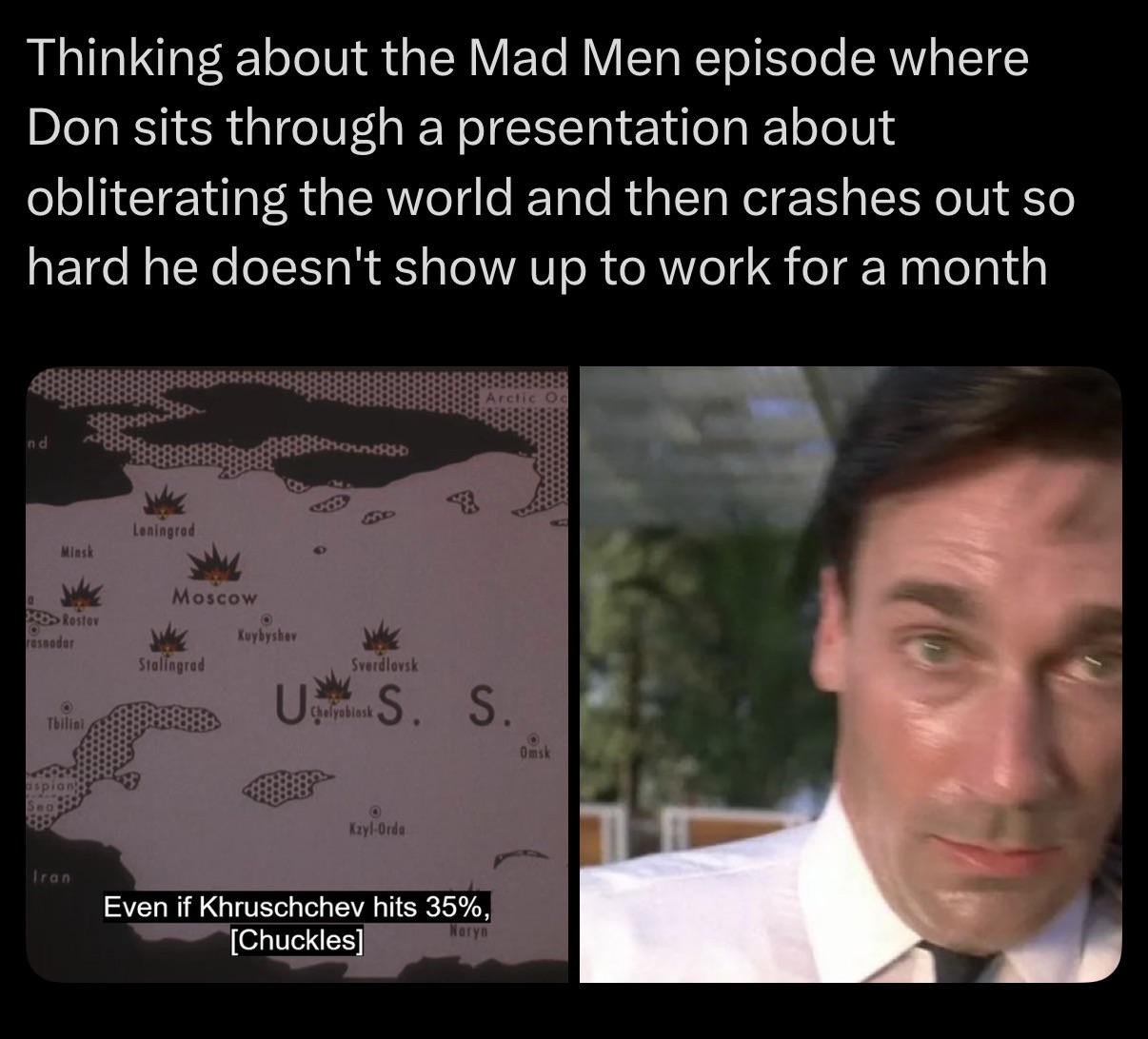 >>219477915this is exactly why I found him so fascinating in the show and why I continue to find him fascinating to this day.It also works very well when you consider that he's effectively a walking metaphor for the dysfunction at the core of America, whilst simultaneously being a high flying participant in the advertising world which is directly complicit in that same dysfunction. They really don't make shows like this anymore.