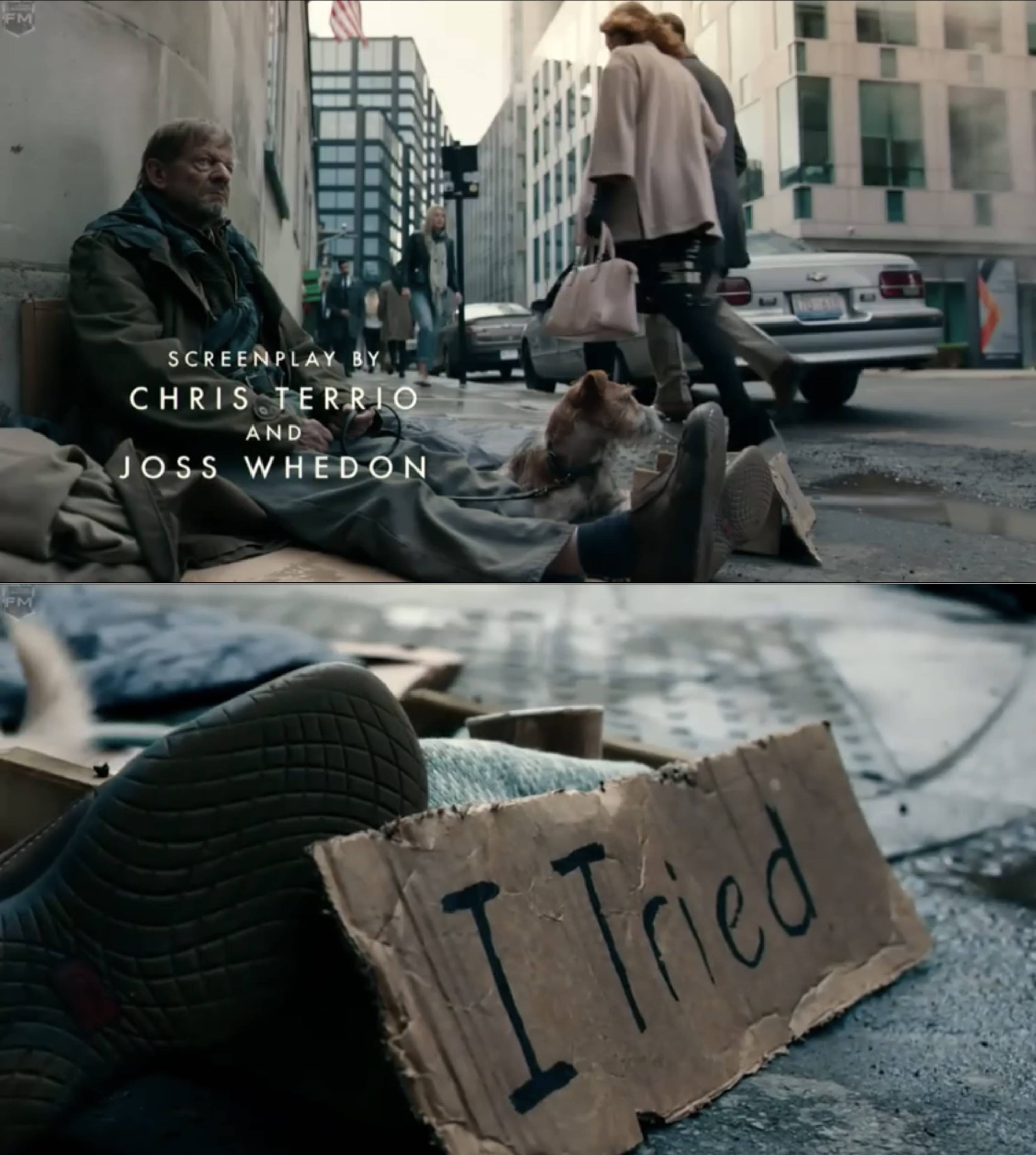 >Some people have pointed out the homeless man's cardboard sign in Justice League's opening credit sequence. Joss Whedon's name appears on screen for his co-writing credit. The movie then immediately cuts to the sign: I TRIED.It wasn't his fault, bros