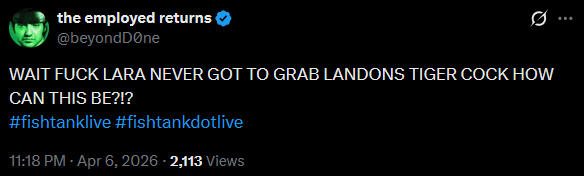 Jet has to be seething and trying to fuck with the audience. These are the worst freeloaders fishtank has ever had, and it's not some random people who just ended up being duds. These are confirmed duds from previous seasons.Jet is sending in people he knows suck and make the show worse.Fucking Bliccy, Binx, Letty, Alex B.All that is missing is Chip with his cardboard.