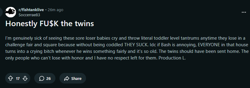 DUDE DRAKE THREW BONGO LIKE A RAGDOLL AND AND EVERYONE IS SEETHING ABOUT BASHIR YET AGAIN, I CAN'T BELIEVE THIS GARBAGE. ALSO THE TWINS SAID THAT BASHIR GIVING THEM 5K AND BLANE 4K WAS A MANIPULATION TACTIC, IT'S INSANE, HE'S ISOLATED IN A FUCKING ROOM BY HIMSELF WHILE LAURA IS AUTISTICLLY FIXATED TO FUCK WITH HIM AND EVERYONE IS ALWAYS CRYING ABOUT "BASHIR THIS BASHIR THAT, BASHIR BLABLABLA".