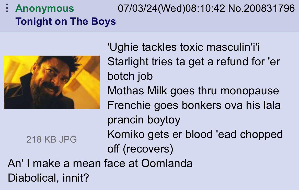 >>219516600omelander is going in the pod and butcher is going to be turned normie by dean winchester
