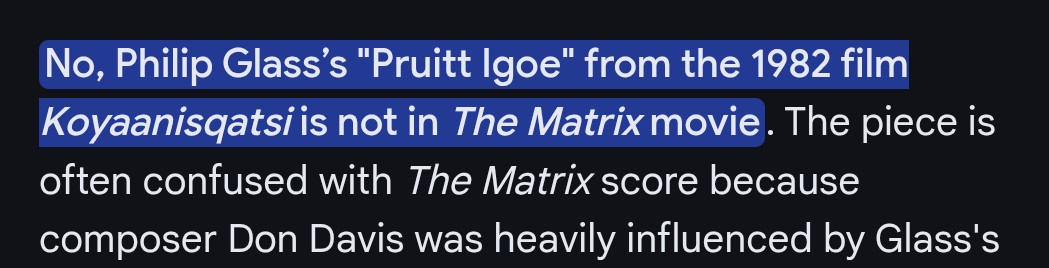 WRONGMOTHERFUCKERS, the Pruitt Igoe theme from Philip Glass was in the matrix. I am not confused. I have not conflated it with anything in the soundtrack.It WAS in the fucking moviehttps://youtu.be/j3q7bT0v9IE?si=E9FQCh7fVMwCCKWk&t=1954What the fucking shit.