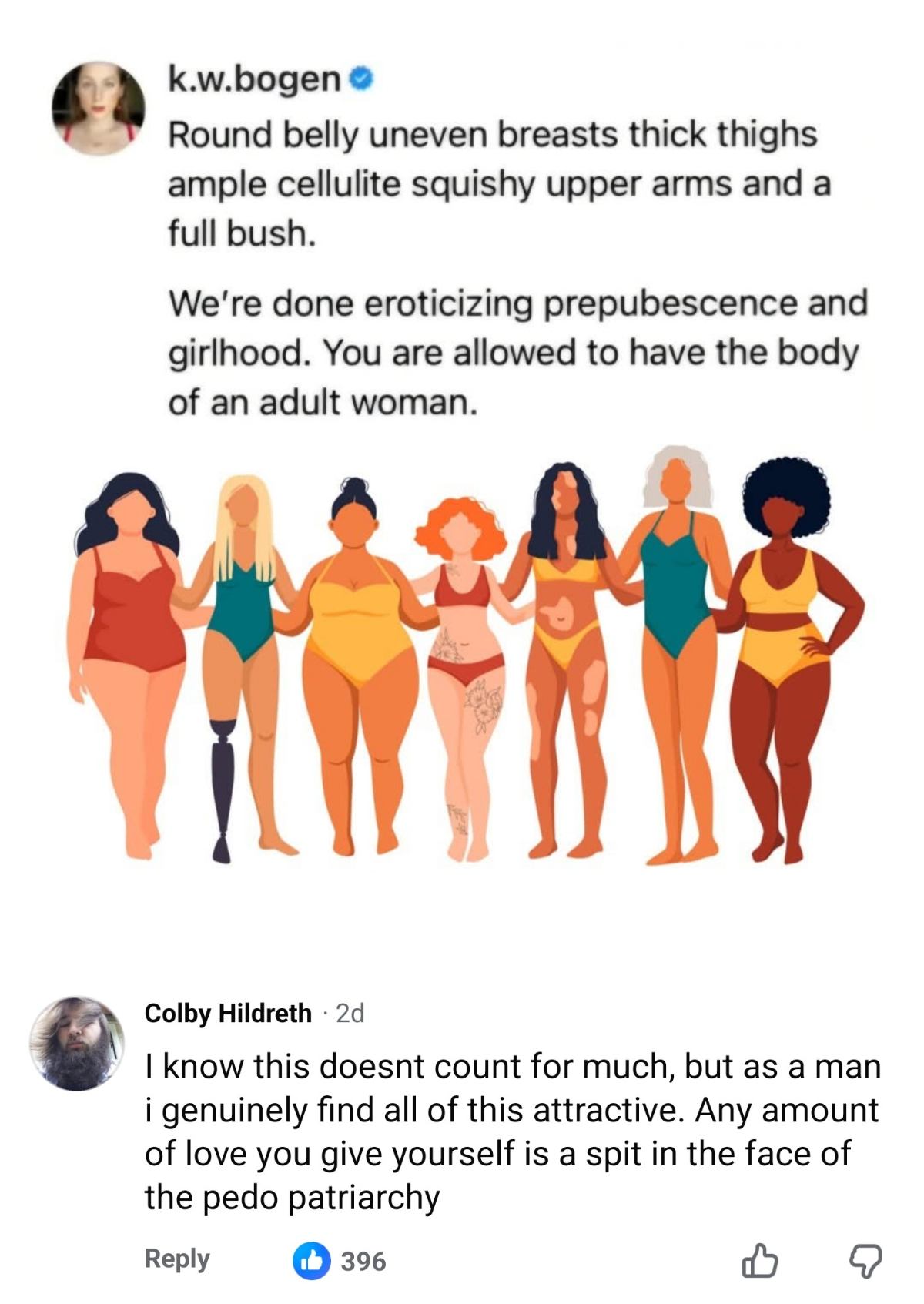 >>219555727>Thick thighs>Full bushEven cellulite are all "indicators" of femininity and most men either don't give a shit or actually like that.A round belly however is a signal of masculine (or post menopausal) fat distribution (or serious visceral fat or worse; ascites/cardiovascular problems) and has never been a neutral or positive feature