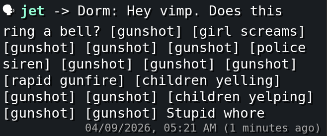 >>219552397Would your mother approve of you sending school shooting reminders to some random girl who was in one while giggling and seeking the approval and attention of random people in chat that arent even your friends because you dont have any?