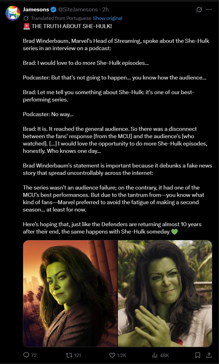 >>219570052>According to Samba TV, a streaming viewership calculator whose methods are not fully understood or fully proven, She-Hulk has debuted to an audience under the original three Disney+ Marvel series. Disney+ Marvel Live Action Show Debuts within Four Days:>WandaVision: 1.6 Million>The Falcon and the Winter Soldier: 1.8 Million>Loki: 2.5 Million>She-Hulk: Attorney at Law 1.5 MillionMake of that what you will, we'll never know the true numbers but I'm going to assume these are roughly accurate comparatively.The rest of hollywood seemed to think it did poorly as wel as the best Maslany could get afterwards was Star Trek Academy.