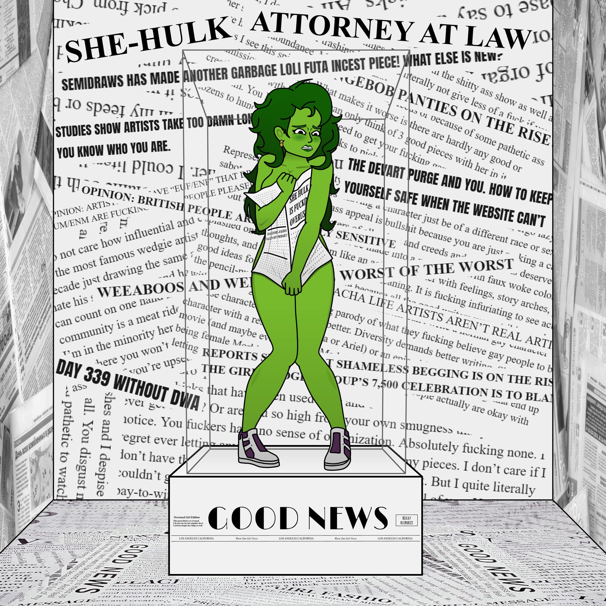 >>219573516She's supposed to look like a tall supermodel when she transforms because otherwise she's just an uppity cunt of a woman with a resting bitch-face. Like, THAT's her conflict as a Hulk. Banner's is more about coping about trauma and having to wrestle with an overwhelming alter-ego. Shulkie's is literally just about confidence and body image. The show would've been all tits and ass if it followed through the spirit of She-Hulk unlike her modern years where Marvel tried to reshape her image.