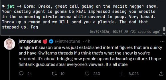 >>219586032first Japan stream right before he came to Kick was incredible and historic, gave us Joel, Akibell, SUSPENDAS (an entire arc and major branch on its own), Hyubsama, etc.first "return" Prisoner stream was greathis traveling across America with Ac7ionman and Joel was comfy and at times hilarious perfect second monitor contentfirst Scavenger Hunt was GREAT and the second one was eh but had its momentsRat Race was again great stuff and the perfect cast honestly, couldn't have been a more perfect cast, second monitor content just really funoh and fucking Australia and New Zealand was also great with the no money gimmick and the crazy characters they meteven the cruise with Nick White was funnyhis "going through Europe with an apple vision pro on 24/7" was fucking ridiculous and funnyHunger Games was one of the best events of all time if you're not a braindead retard who can't operate a map and is unwilling to find and curate your own streaming experience (there are 60 individual streams to choose from, you follow the action!!!! don't you guys love that? switching cams? apply yourself nigger).>>219586094Fishtank is the knockoff you wretchedly stupid fucking nigger
