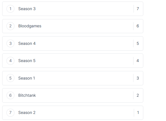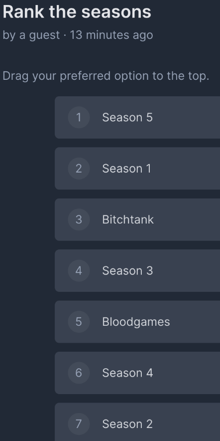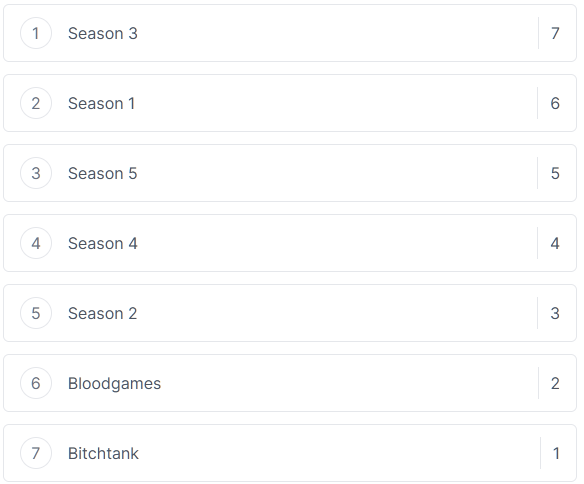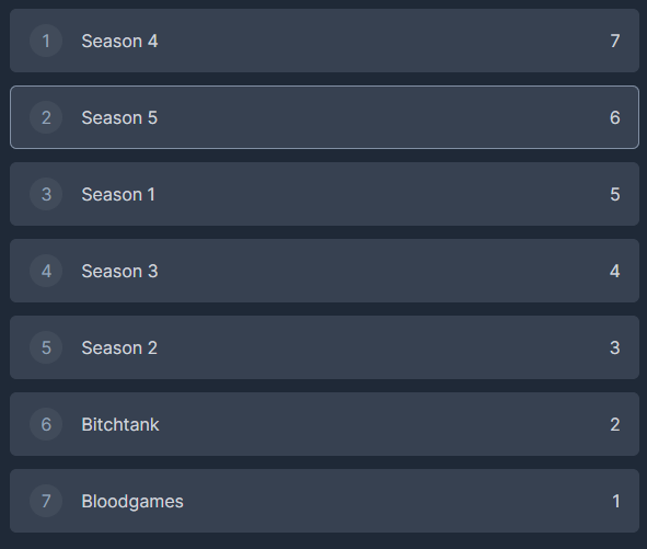 kino season honestly.S2 > Bloodgames > S5 > S1 > S4 > S3