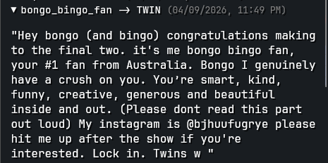 >>219588320I'd say it was rigged for the twins and rigged against James who is a normal guy and not terminally online.There was a chance Bashir could win but zero chance for James to win.