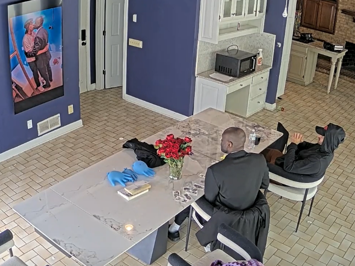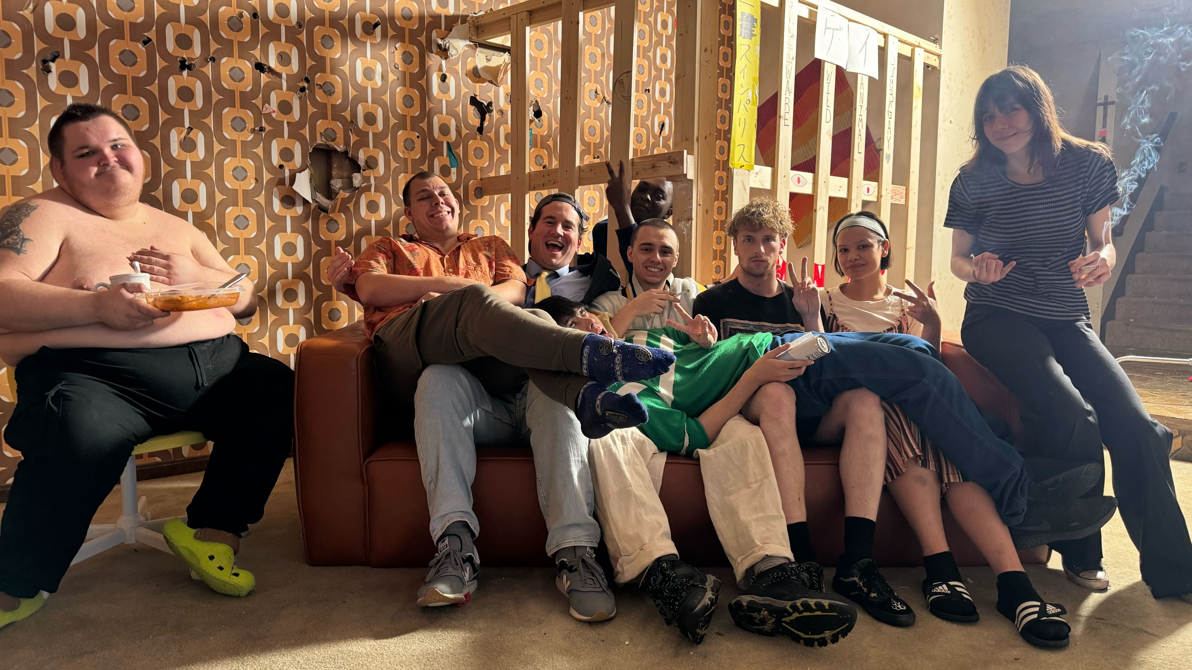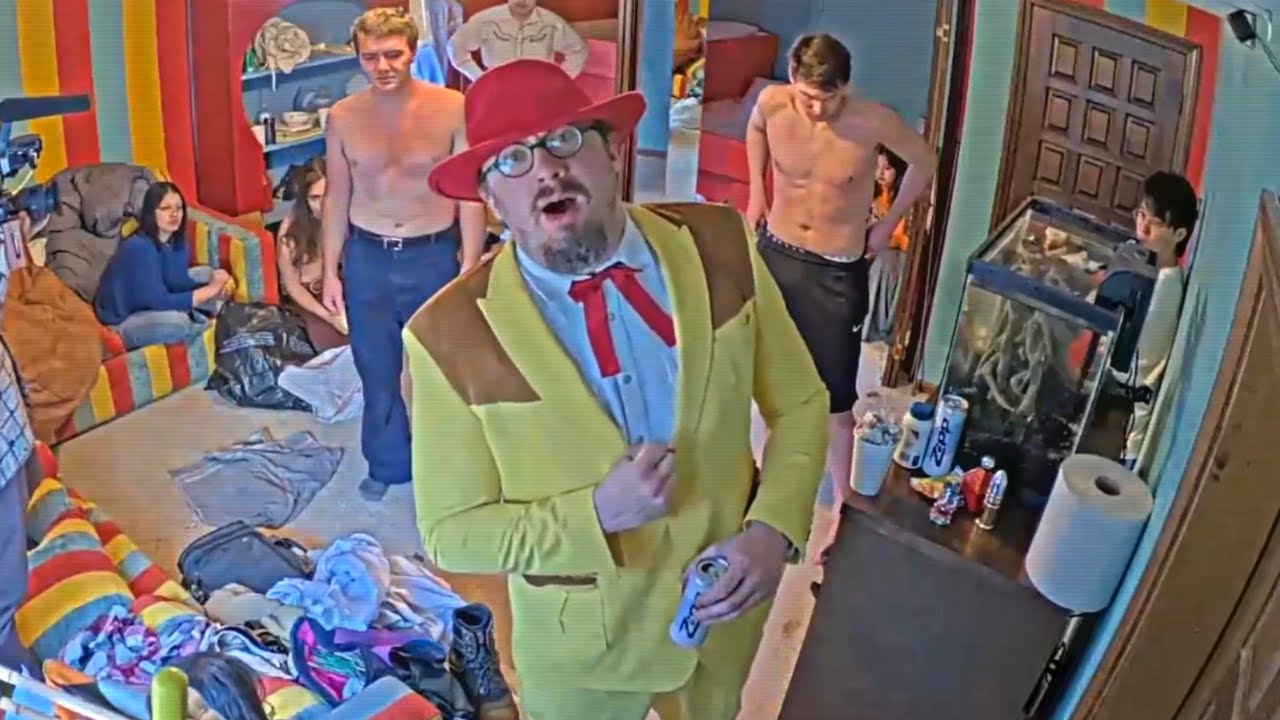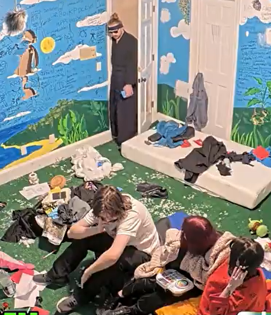 >>219588275Landon in the goo room, off camera. Vimp on a bed in the glassroom. Bliccy I forget, probably the bar couch.
