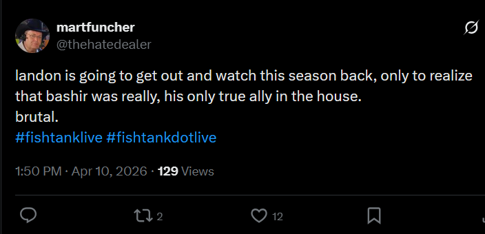 Vicky edition--Landon rejected by VIMP-- Burt has mogged Landon to death with no chance for recovery-- The Twins have won immunity and are now in the final-- James and Bashir will battle to be in the final two-- /ftl/ is seething because they doubted how smart the twins are again>Links:https://fishtank.rip/https://www.fishtank.livehttps://kick.com/fishtankhttps://fishtank.observer/https://classic.fishtank.livehttps://x.com/fishtankislivehttps://www.instagram.com/fishtank.live/https://www.youtube.com/@fishtankislivehttps://en.wikipedia.org/wiki/Fishtank_(web_series)https://fishtanklive.fandom.com/wiki/Fishtanklive_Wiki Previous >>219583826 >>219583823