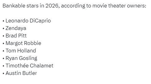>dicaprio, pittveterans at this point, people know who they are and they are usually in kino>goslingmillennial, but he proved he is bankable recently with project hail mary>timmy, butler, zendayayeah, yeah, slow down there buddy
