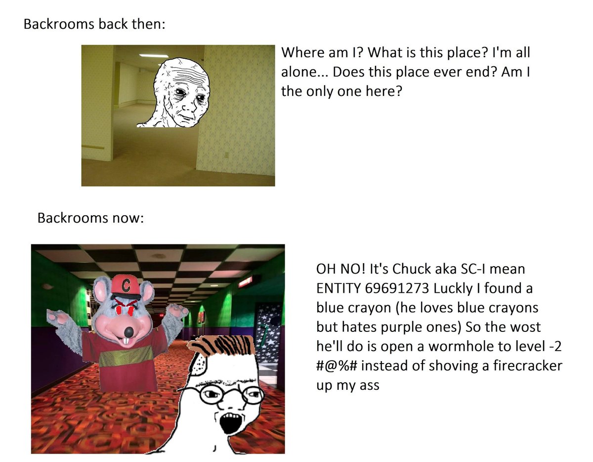 >>219645568>le concept of backroom is that... you le glitch out like in muh 3d video game and you.. spawned in this empty pool and hotel room like in gmod... and then some monster chase you like in le slendermanthey are literally based on digital toy because zoomer grow up with video games and computer