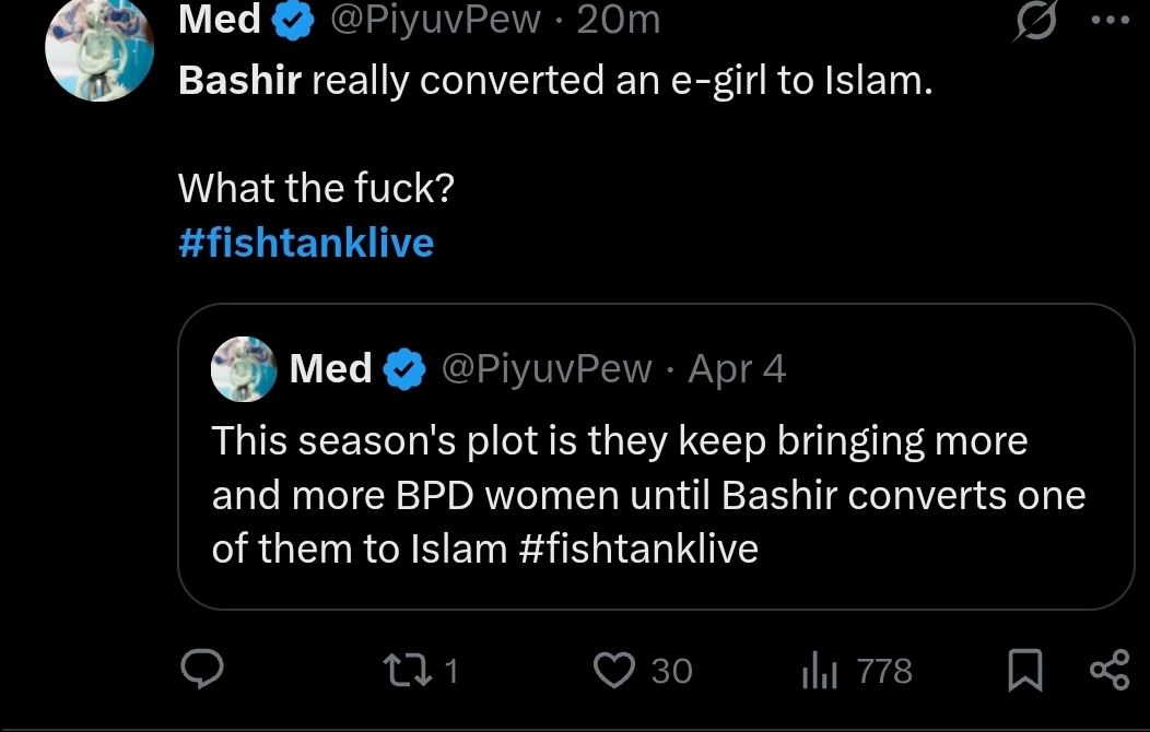 >obviously comes on the show to farm simps of her own separate from binx's dwindling amount>starts off strong by being bashir's steadfast ally and breaking from binx (which obviously pisses her off)>quickly betrays his trust by following the social dynamics of the house>gets destroyed by TTS for being a backstabber and then traumatized with school shooting TTSes>starts stringing a retarded janitor along, further souring the viewers on her>eventually goes back on all of it after enough negative TTSes>course corrects too hard and starts reverting to islam, souring people on her again for being performativeShe might be one of the most retarded people they've had on the show, genuinely. Not a single individual thought in her head. Entirely molded by the people around her
