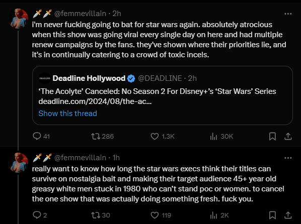 >>219648492>Does nothing with this for 2 seasonWrong. Mando getting the darksaber at the end of S2 instead of her was a fucking great setup for S3. The show should've turned into a real Mandalorian show with Mando being forced to lead and reunite the Mandalorians under one banner while missing Grogu.BUT they couldn't help themselves, they had to put Grogu back with Mando in a completely different show and instead of doing something with the darksaber, Mando just give it to her like if it was nothing.They ruined any potential character development for them.There is nothing left to do with them, so no one fucking cares about them anymore.