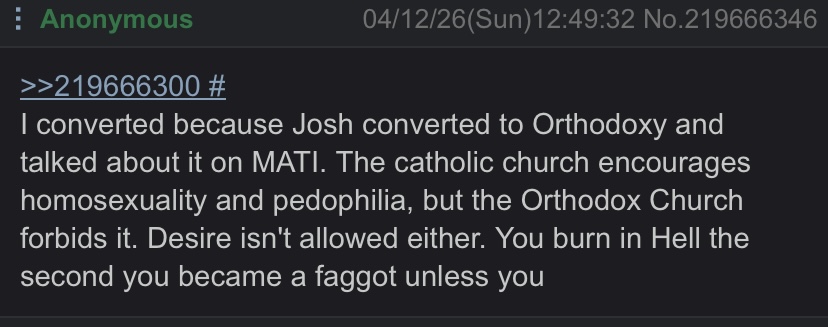 >>219666346I really hope this is bait because "I converted to Orthodoxy because of the guy who owns kiwi farms and its based as fuck sinners go to hell with no chance of redemption" is contender for most embarrassing post this season