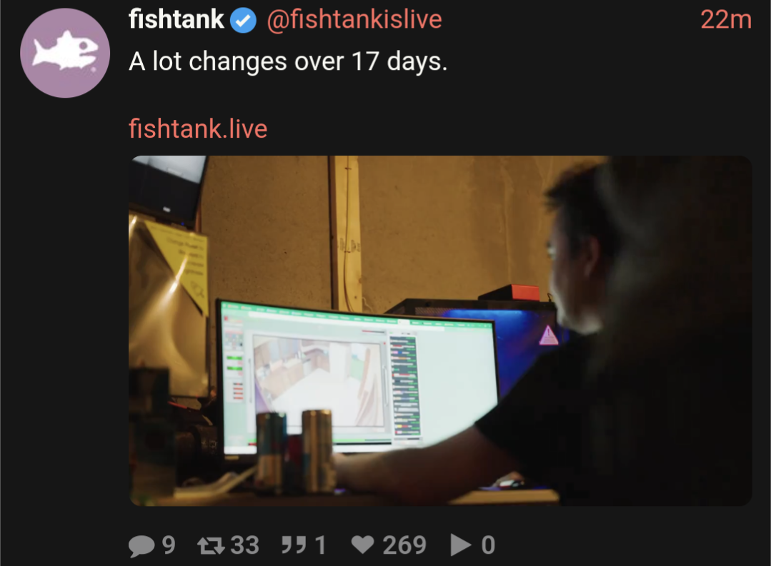 >>219668211It was scuffed, it was off the cuff, the stream didn't always work, but it had so much fucking SOVL compared to this shit that's going on right now. I really loved the R.V. streams, road trips are my favourite thing to do irl so seeing Fishtank go on the road in an R.V. was peak for me.