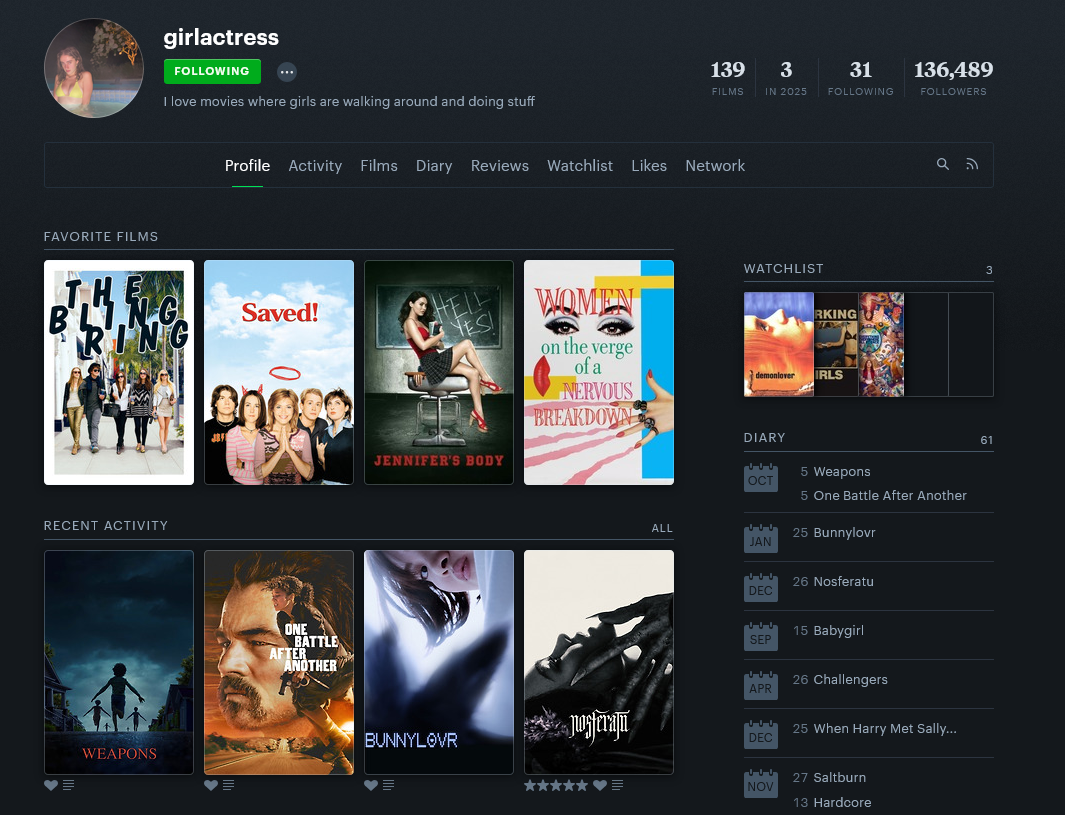 I was surprised at how many followers Rachel Sennott has on letterboxd. Other celebrities like Anne Hathaway, Dafne Keen, Kyle MacLachlan, Caylee Cowan, Mckenna Grace, etc don't have anywhere near that amount of followers.