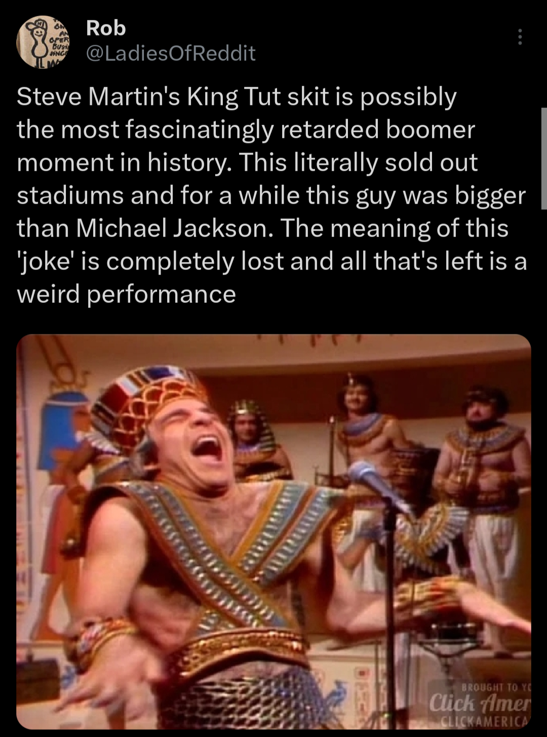 >>219704464>bigger than Michael JacksonMJ didn't release his first solo adult album until 1979, whilst King Tut was in 1978. Steve Martin is annoying, but why does this skit in particular fry zoomer brains?
