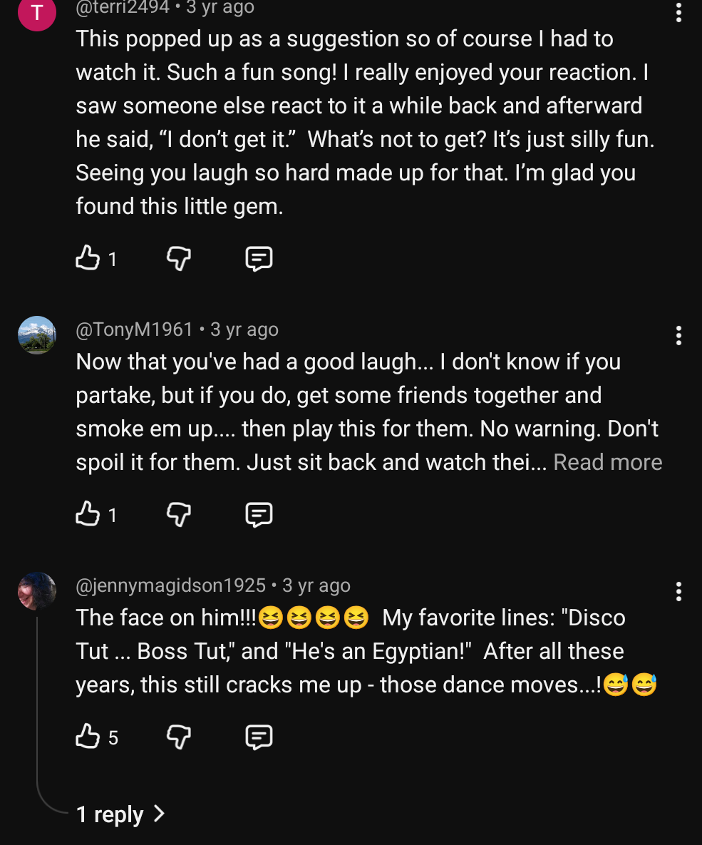 >>219695375>HE'S DOING WACKY FACES WHILE SINGING ABOUT KING TUT!It was a meme dude. Think of how many stupid memes you've laughed at over the years. This was a boomer meme.