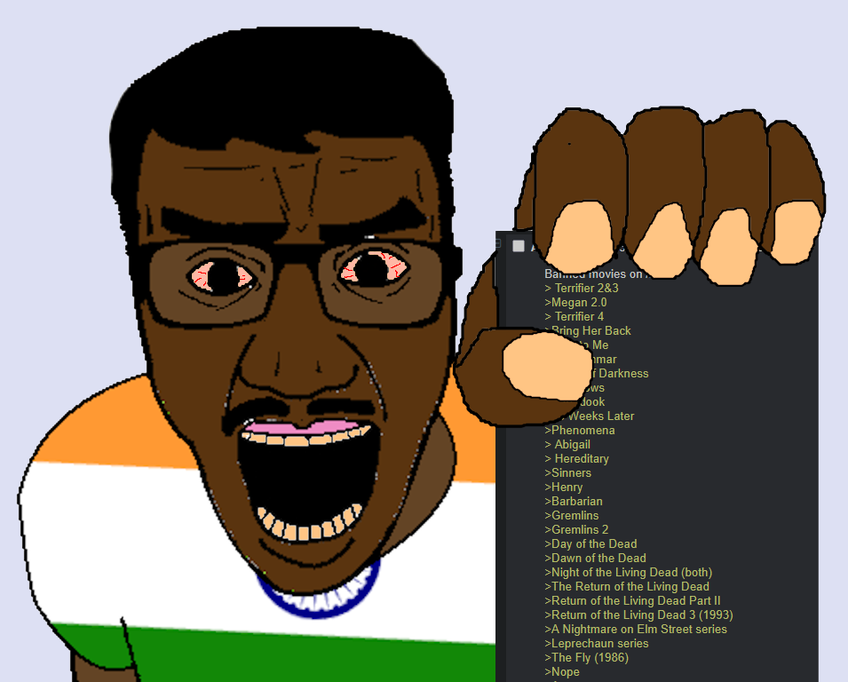 Banned movies on /hor/>Terrifier 2&3>Megan 2.0>Terrifier 4>Bring Her Back>Talk to Me>Midsommar>Army of Darkness>It Follows>Babadook>28 Years Later>Phenomena>Abigail>Hereditary>Sinners>Henry>Barbarian>Gremlins>Gremlins 2>Day of the Dead>Dawn of the Dead>Night of the Living Dead (both)>The Return of the Living Dead>Return of the Living Dead Part II>Return of the Living Dead 3 (1993)>A Nightmare on Elm Street series>Leprechaun series>The Fly (1986)>Nope>Angst>Oddity>Lair of the White Worm >Night of the Demons 2>horror-comedies>VHS series during the month of October>feminist horror is also banned*>the entire animation genre is also banned*>all of David Cronenberg’s films*