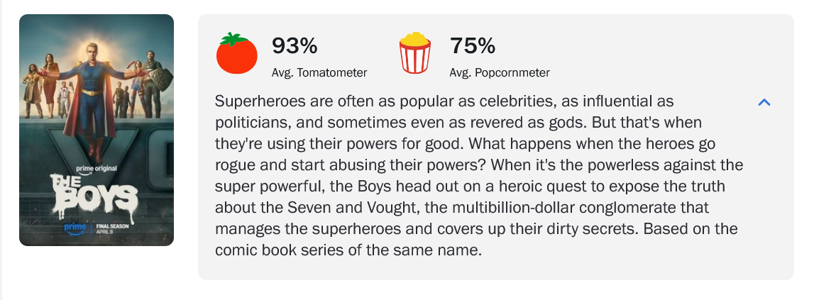 >>219708966I don't think a single poster has praised The Boys, maybe the first season at most but it's pretty much collectively hated, and it's only watched to discuss how bad it is later.