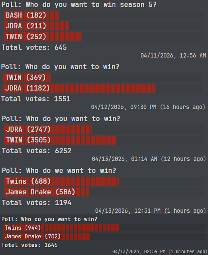 Score: Twins 9 | James 11>FTL News:--Jet's Party House-- finale is happening-- Will James Drake continue his lead or will the twins make a comeback-- alex has returned to argue with burt-- The mudslime has been forgotten forever...>Links:https://fishtank.rip/https://www.fishtank.livehttps://kick.com/fishtankhttps://fishtank.observer/https://classic.fishtank.livehttps://x.com/fishtankislivehttps://www.instagram.com/fishtank.live/https://www.youtube.com/@fishtankislivehttps://en.wikipedia.org/wiki/Fishtank_(web_series)https://fishtanklive.fandom.com/wiki/Fishtanklive_WikiPrevious: >>219713356