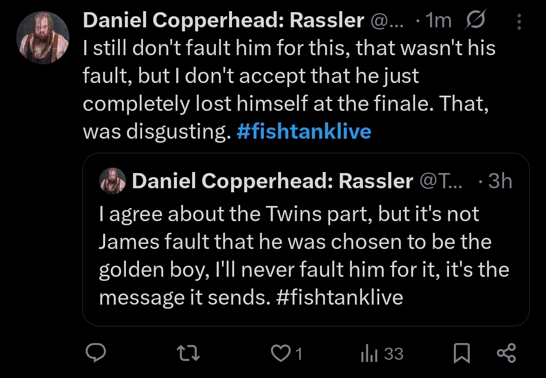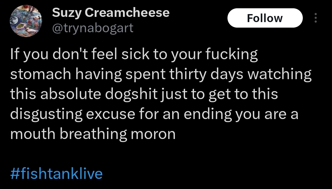 >>219744208he was one of the people I had in mind specifically. twitter is for fags but I have an account and there are some people there that are in a massive seethe. I just really don't like people who enjoy a certain aspect of the show and demand that the show be tailored to what they specifically like, and they call that "real fishtank" or whatever