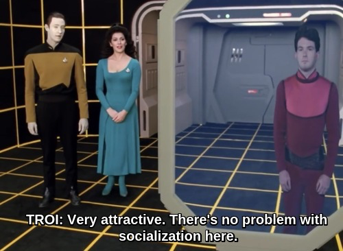 >>219761690Troi's intimate knowledge of the humanoid psyche has led her to become something of a prankster. She knows exactly what to say to an autistic man to make him make an even bigger ass of himself in public.