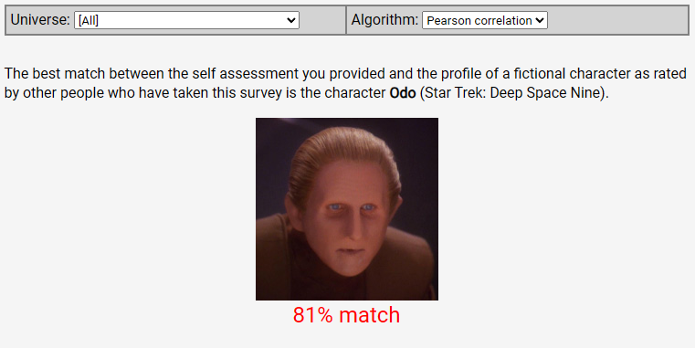 I haven't watched any Trek, but apparently the fictional character I'm most like is OdoWhat does that mean exactly