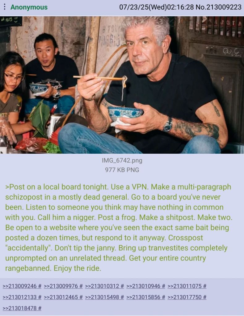 https://www.bensixsmith.com/p/an-anthony-bourdain-mystery>Quotes are funny things, can you ever have 100% assertion that any quote was directly from one person ? Maybe if you have video or audio but with AI now thats not even possible. What we are left with is the character of the quote. I knew Tony, I hung out with him on a few occasions before he made it big as Anthony Bourdain and I can assure he said something similar to me on many occasions. Maybe not that direct quote but damn near close to the fundamental ideas behind it. It was at the core of his sensibilities and love for culture, food, and life. So yea it’s totally sounds like the Tony I knew.It's a gay quote from a faggot that hung out with "Tony" "on a few occasions"