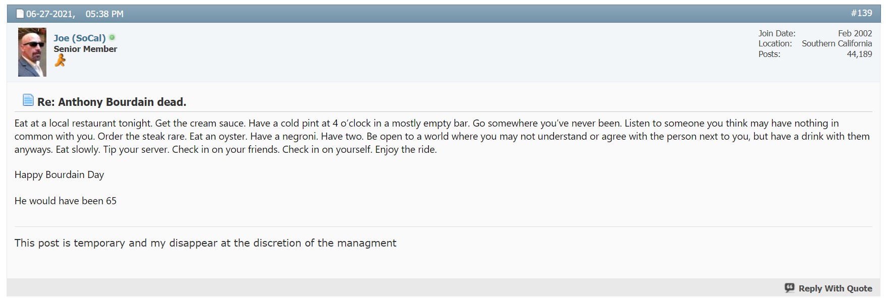 >>219759069>Be open to a world where you may not understand or agree with the person next to you, but have a drink with them anyways.>Check in on your friends. Check in on yourself.Wholesome slop. Whoever wrote this wasn't even trying to sound like Bourdain