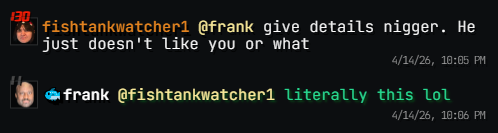 -- Steinful says the wiggers paid thousands of dollars to "own" the fishtank subreddit https://x.com/stainfool/status/2044177699028005338