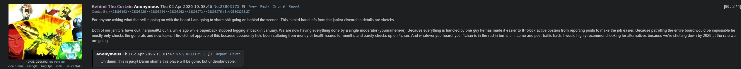 >>219775548Well whenever you are "free", it's going to be out of exhaustion, because the site's been going under controlled demolition. They (mods and/or glowniggers) are slowly suffocating the site to where no one cares about imageboards to make a new one, not that altchans work out anyway.https://desuarchive.org/m/thread/23803175/